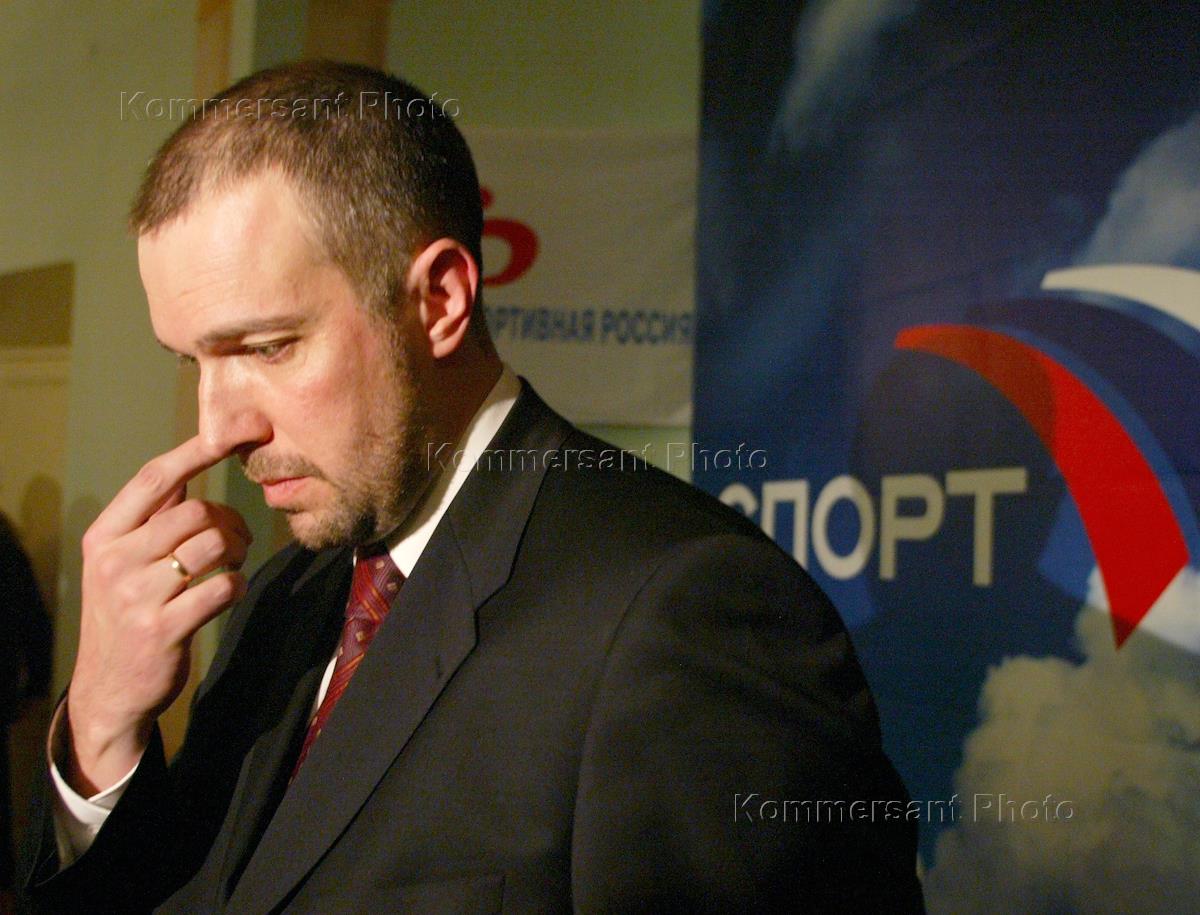 Директор дирекции спортивных программ Российского телеканала (РТР) Василий Кикнадзе во время пресс-конференции, посвященной предстоящему выходу в эфир федерального спортивного телеканала. Пресс-конференция состоялась в Государственном комитете России по физической культуре и спорту.