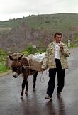 В Ереване все спокойно. Крестьянин с груженым поклажей осликом на горной дороге в Котайкской области Армении в ущелье горной реки Гохт.