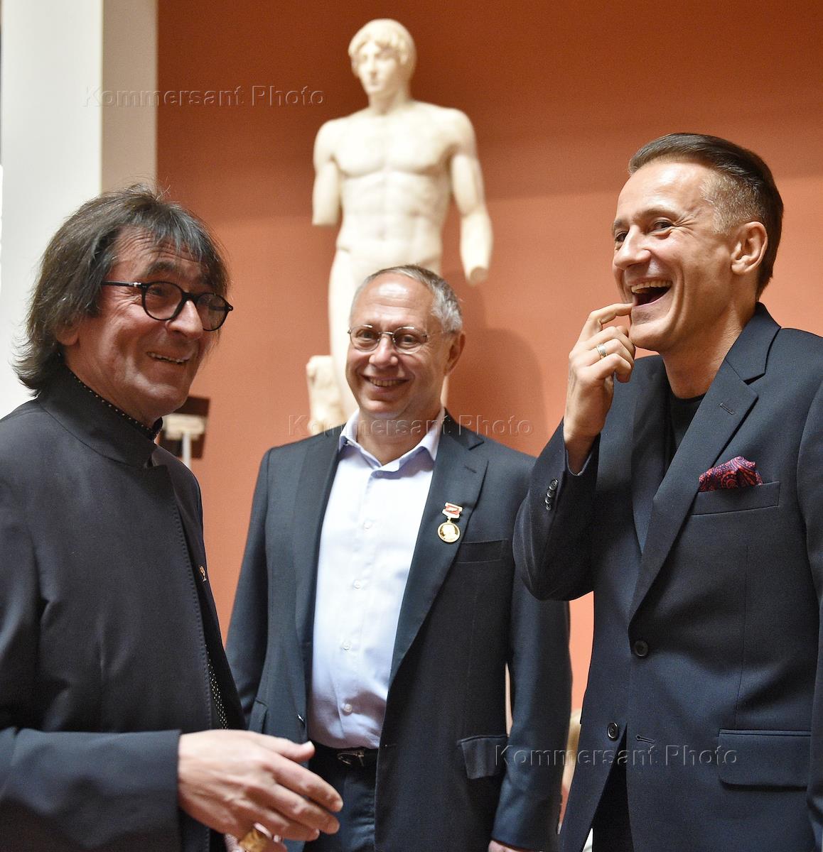 V ежегодная торжественная церемония вручения "Золотой медали имени Льва Николаева" выдающимся деятелям науки и культуры современности. Продюсер Александр Митрошенков (второй слева), актер, художественный руководитель Театра имени М.Ермоловой Олег Меньшиков (в центре) и телеведущий Дмитрий Дибров во время церемонии в Государственном музее изобразительных искусств (ГМИИ) имени А.С.Пушкина.