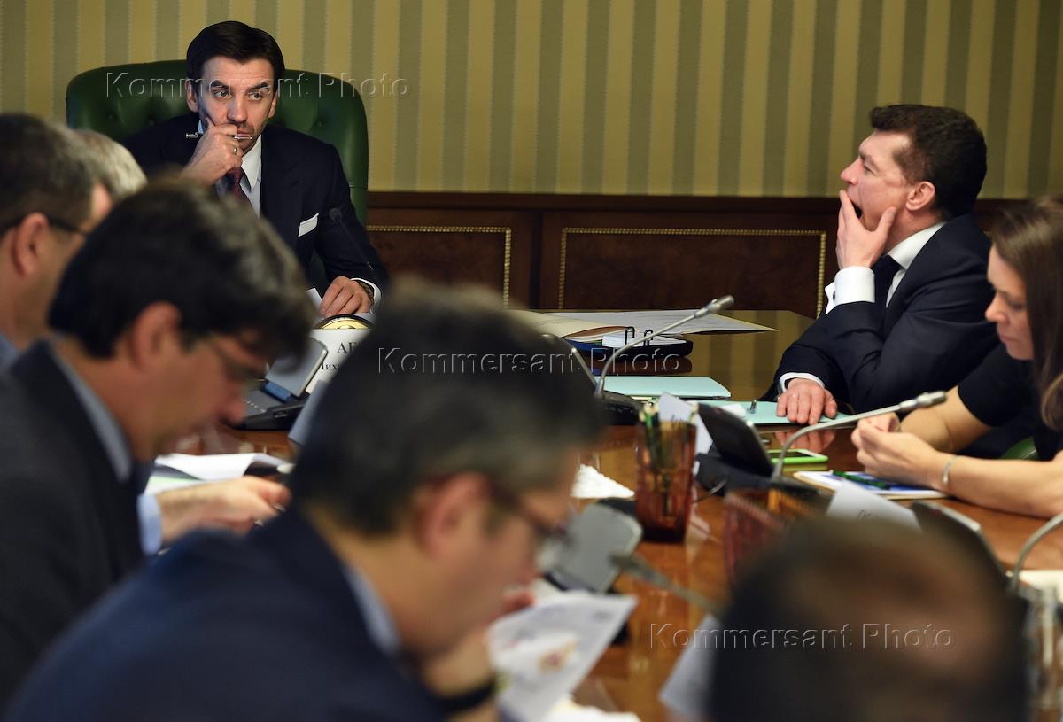 Министр России по связям с Открытым правительством Михаил Абызов (в центре) на заседании правительственной комиссии по координации деятельности Открытого правительства России, с предстацией рейтинга открытости федеральных органов исполнительной власти. Заседание прошло в Доме правительства России.