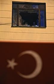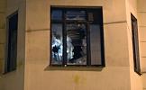 The protest action against activities of the sky forces of Turkey . The action held by the embassy of Turkey. The broken window in the embassy.
