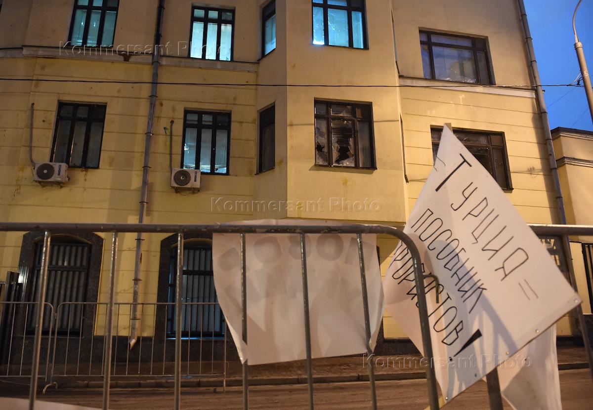 The protest action against activities of the sky forces of Turkey . The action held by the embassy of Turkey. The broken window in the embassy.