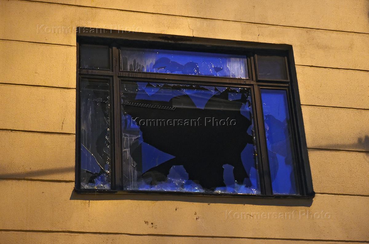 Акции протеста против действий Военно-воздушных сил Турции у посольства Турции. Разбитое окно в здании посольства.