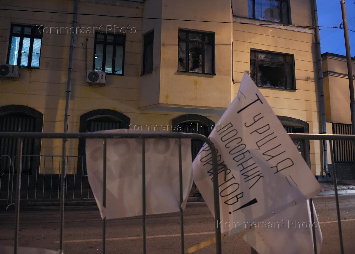 The protest action against activities of the sky forces of Turkey . The action held by the embassy of Turkey. Policemen by the embassy.