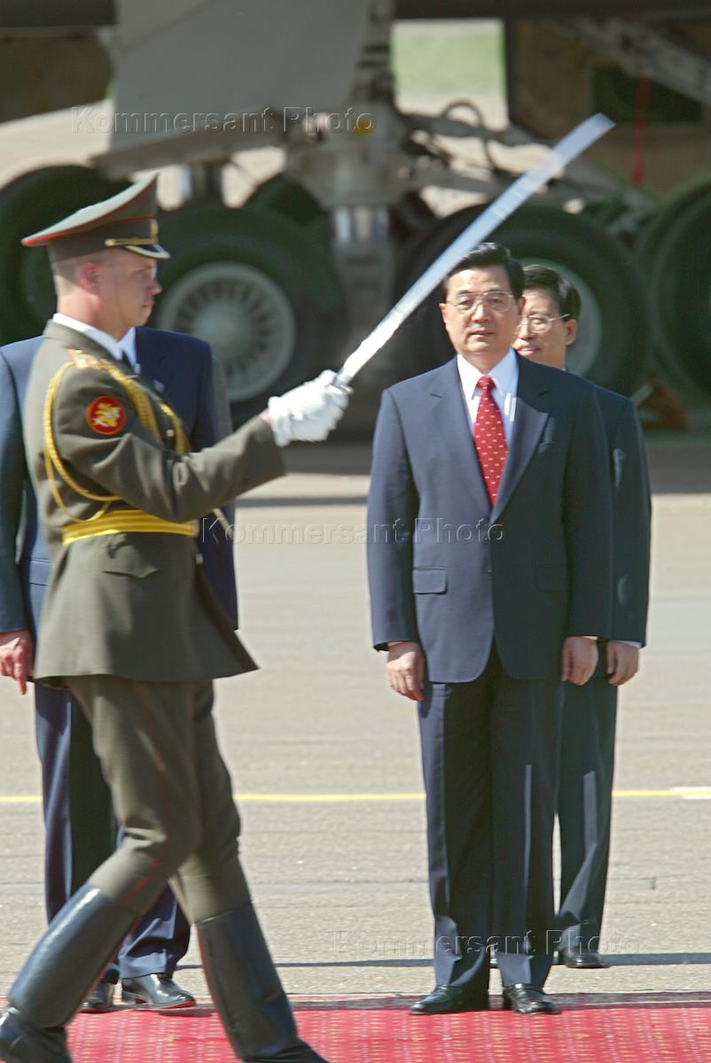 Chinese leader Hu Jintao walks along the line of guards of honour on arrival in the Moscow Vnukovo-2 airport on an official visit to Russia.