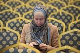 Форум "Россия и Саудовская Аравия - новые перспективы торгово-экономического и инвестиционного сотрудничества". Жанровая фотография. Женщина в хиджабе с мобильным телефоном в зале форума.