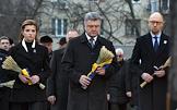 Президент Украины Петр Порошенко (в центре) с супругой Мариной (слева) и премьер-министр Украины Арсений Яценюк (справа) во время участия в мероприятиях в связи с Днем памяти жертв голодоморов в Национальном музее "Мемориал жертв Голодомора" в Киеве.