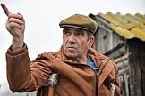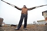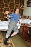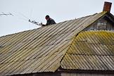 Виды села Военково. Жанровая фотография. Молодой человек устанавливает телевизионную аннтену на шиферную крышу дома.