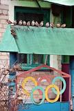 Виды села Военково. Жанровая фотография. Воробьи сидят на крыше калитки жилого сельского дома.