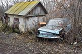 Виды села Военково. Старые дом и кузов автомобиля "Запорожец".