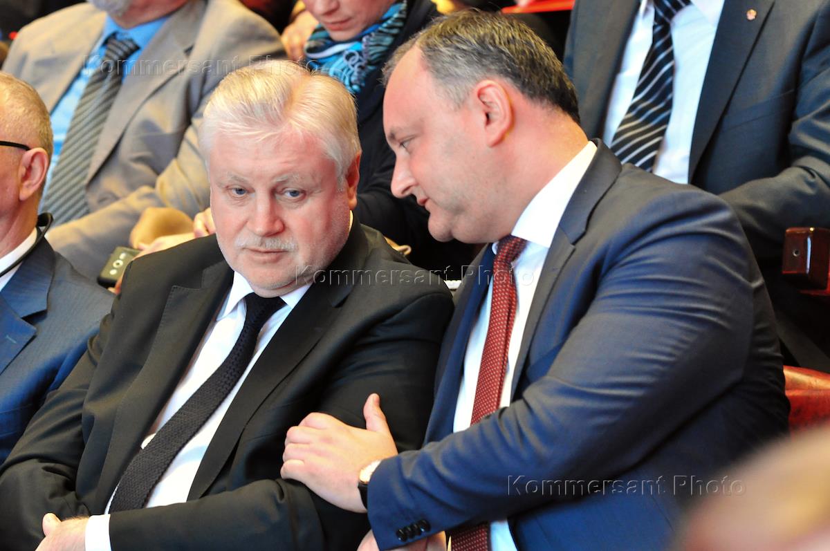 Лидер партии "Справедливая Россия", член комитета Государственной думы России по жилищной политике и жилищно-коммунальному хозяйству Сергей Миронов (слева) и лидер Партии социалистов Республики Молдова Игорь Додон (справа) на XIII съезде Партии Социалистов Республики Молдова (ПСРМ).