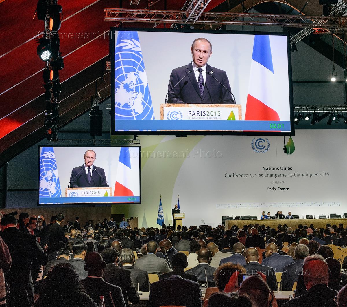 XXI Конференция стран-участниц Рамочной конвенции ООН по вопросам изменения климата. Президент России Владимир Путин на конференции.
