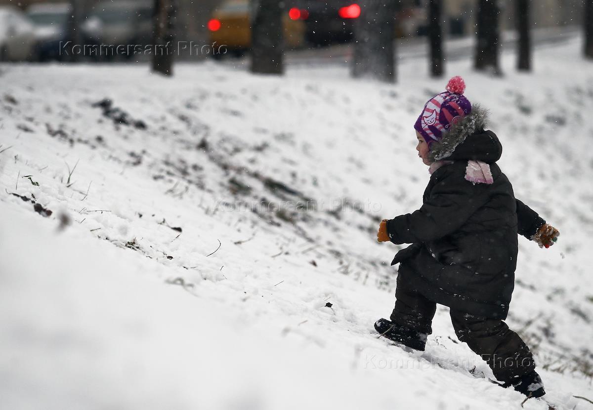 Жанровая фотография. Снегопад в Москве. Ребенок гуляет в парке.