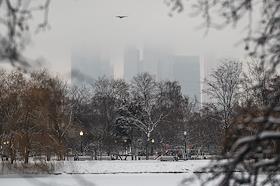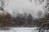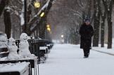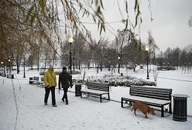 Жанровая фотография. Снегопад в Москве. Люди гуляют с собакой в парке.
