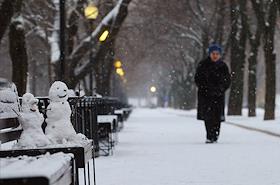 Жанровая фотография. Снегопад в Москве. Снеговики на лавке в парке.