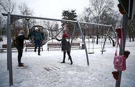 Жанровая фотография. Снегопад в Москве. Дети катаются в парке на качелях.