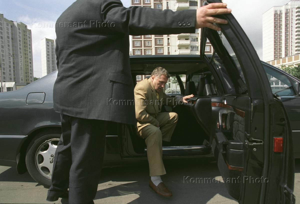 Лидер Либерально-демократической партии России (ЛДПР), заместитель председателя Государственной Думы Владимир Жириновский выходит из машины перед школой №1184, куда он прибыл на торжества по случаю последнего звонка.