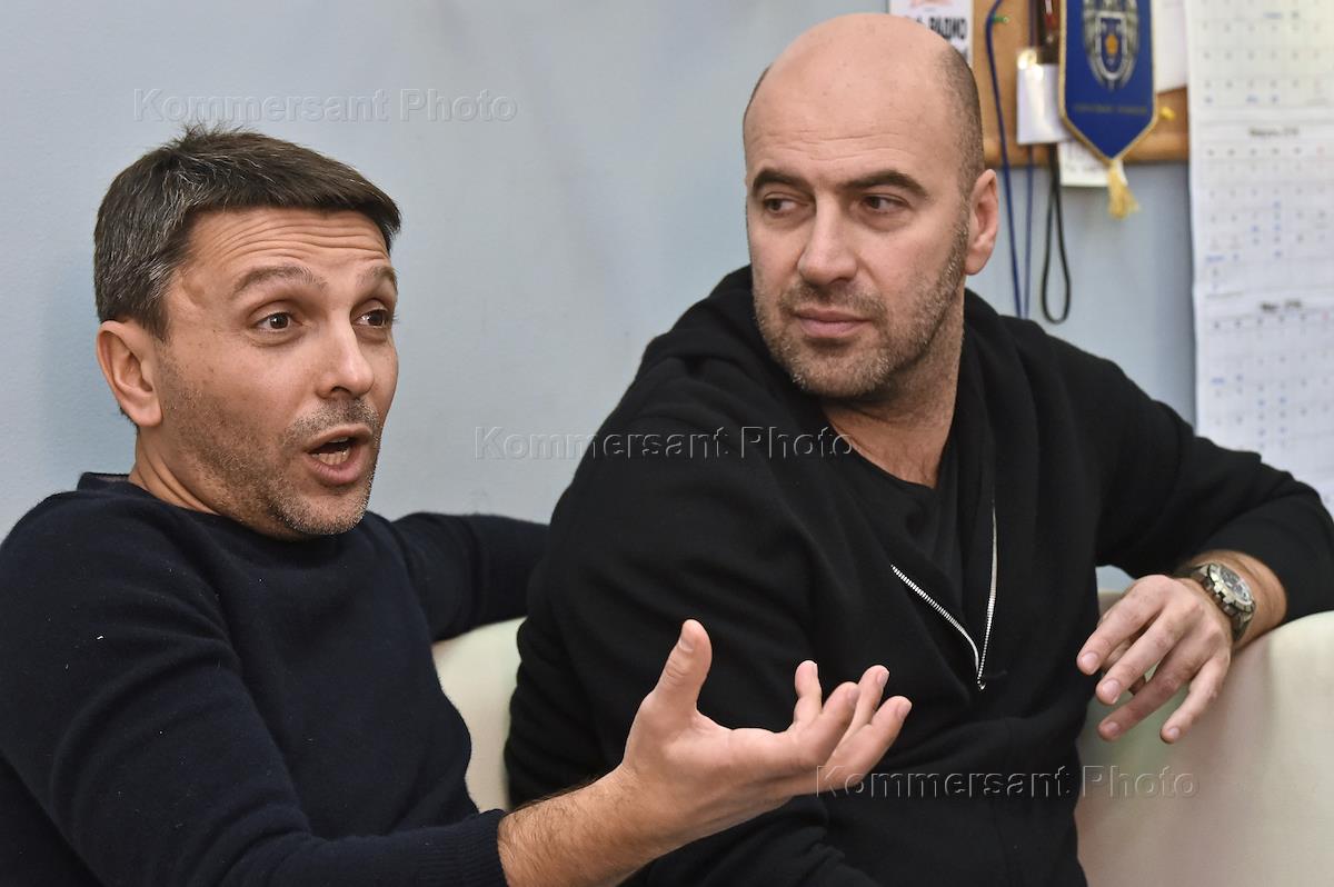Участники комического театра "Квартет И" Леонид Барац (слева) и Ростислав Хаит (справа) во время интервью в ДК им. Зуева.