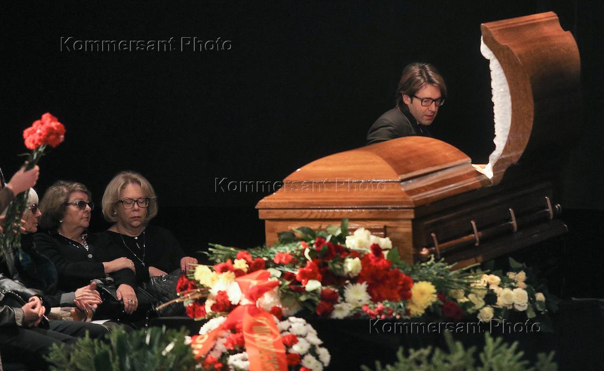 Церемония прощания с кинорежиссером Эльдаром Рязановым в Центральном доме литераторов. Певица Алла Пугачева (в центре) и артист эстрады Максим Галкин (справа) во время церемонии.