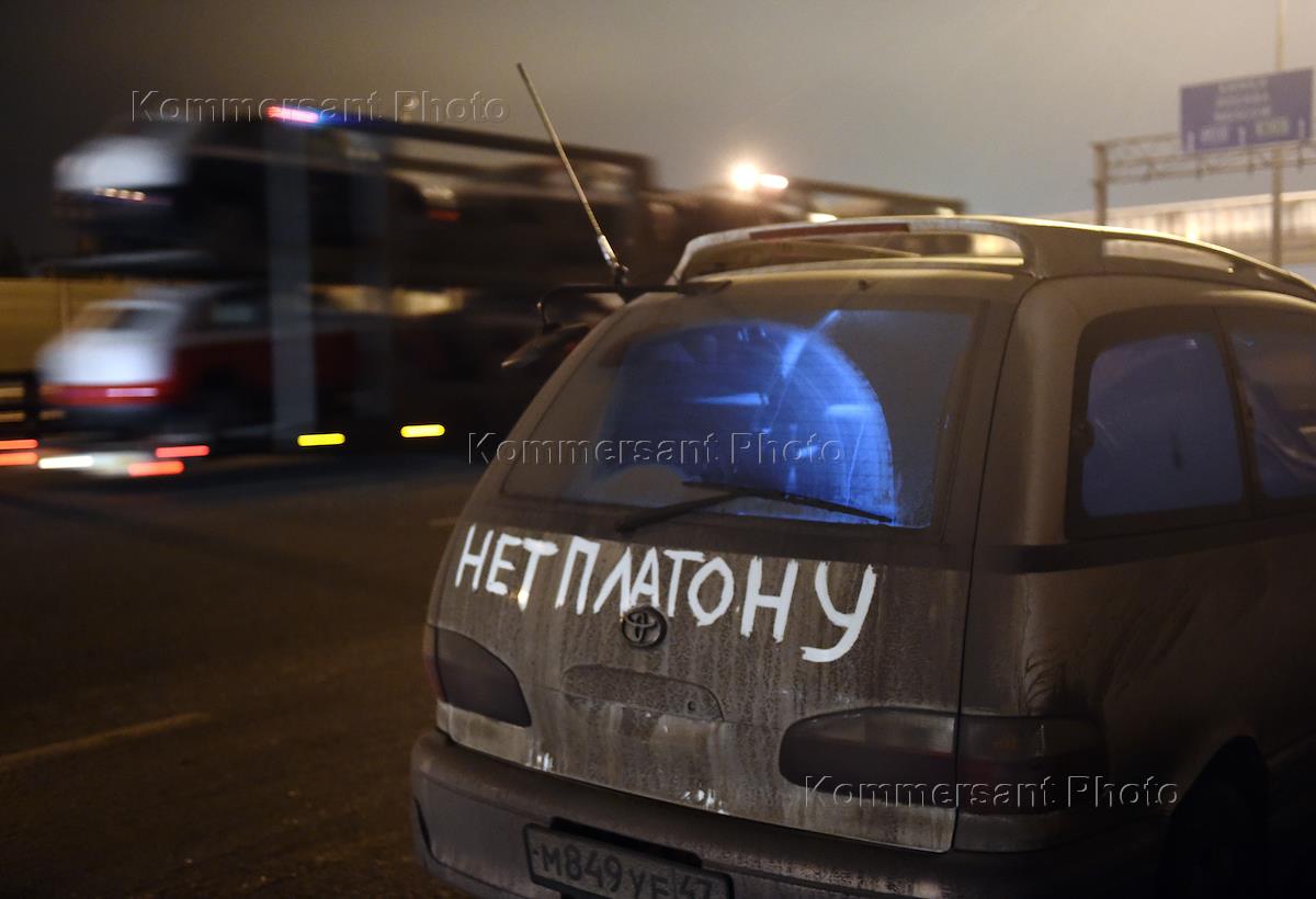 Всероссийская акция протеста водителей многотоннажных грузовиков, против системы сбора платы за проезд по федеральным трассам ("Платон"). Дальнобойщики во время акции на трассе Москва - Санкт-Петербург.