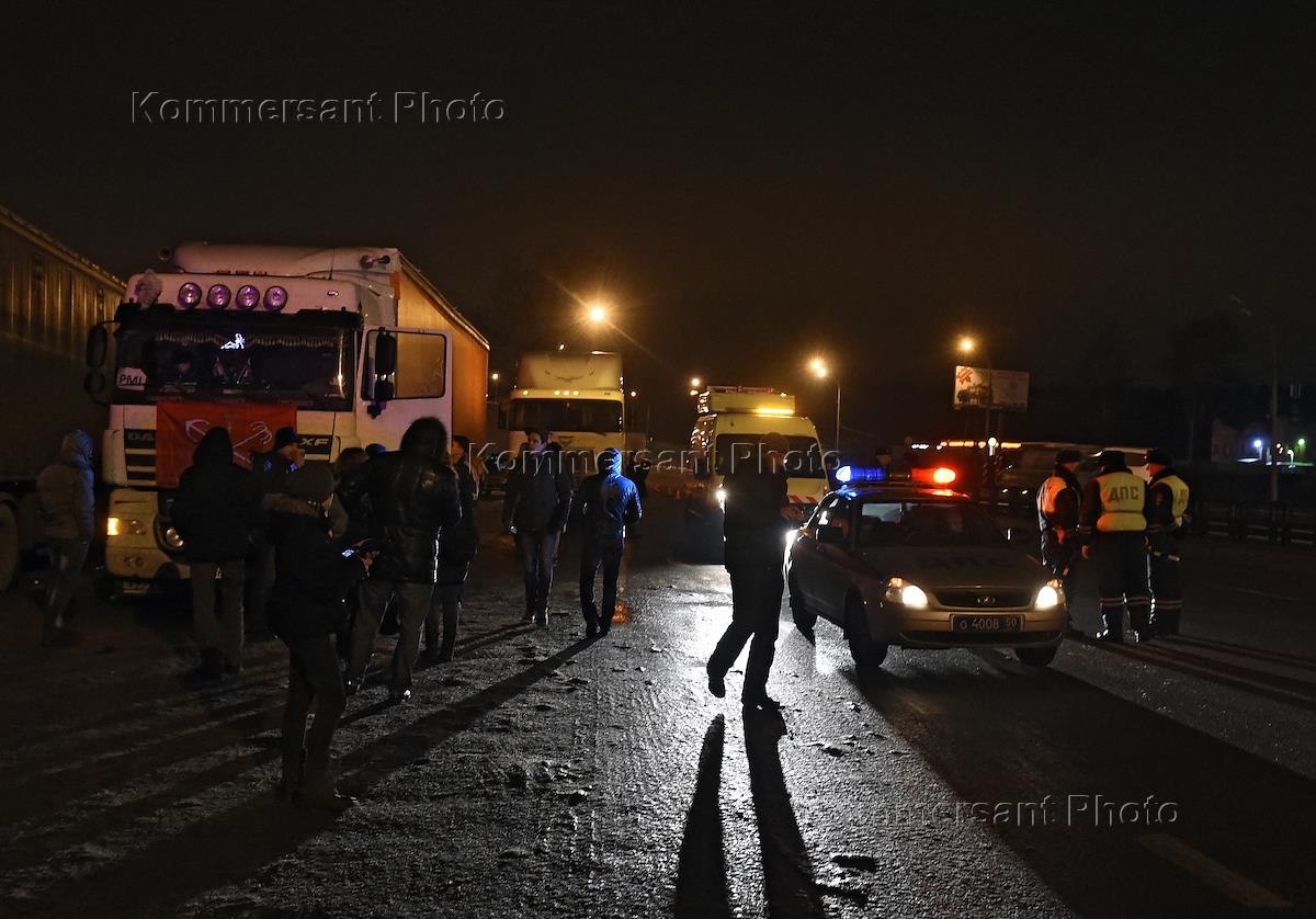All-Russia protest action of drivers of multi-deck trucks. The action is against the 'Platon' toll collection system (truckers have to pay taxes for each kilometer of federal highways they travel). Longhaul truckers are during the action on the highway from Moscow to Saint-Petersburg.