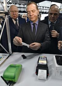 Председатель правительства России Дмитрий Медведев (в центре) и министр финансов России Антон Силуанов (слева) во время осмотра центра обработки данных №1 (ЦОД №1) в Городце.