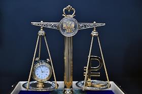Жанровая фотография. Центр обработки данных №1 (ЦОД №1) в Городце. Часы и знак российского рубля на чаше весов.