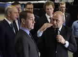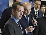 Председатель правительства России Дмитрий Медведев (справа) во время осмотра центра обработки данных №1 (ЦОД №1) в Городце.