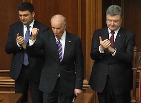 Слева направо: председатель Верховной Рады Украины Владимир Гройсман, вице-президент США Джозеф Байден и президент России Петр Порошенко на заседании Верховной Рады Украины.