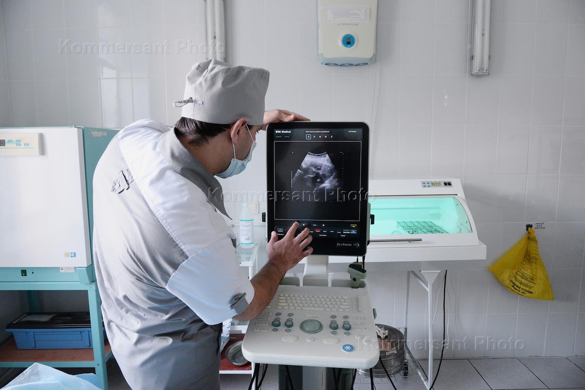 Жанровая фотография. Сотрудница медцентра делает УЗИ беременной девушке.