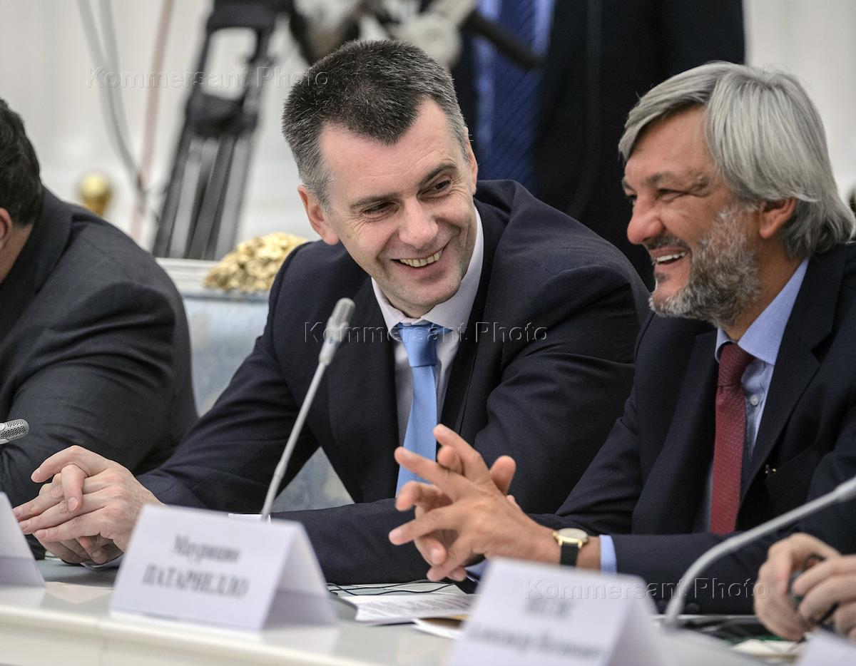 Бизнесмен Михаил Прохоров (слева) и основатель и член координационного совета Московской школы Управления "Сколково" Сергей Попов (справа) во время заседания попечительского совета Мариинского театра в Кремле.