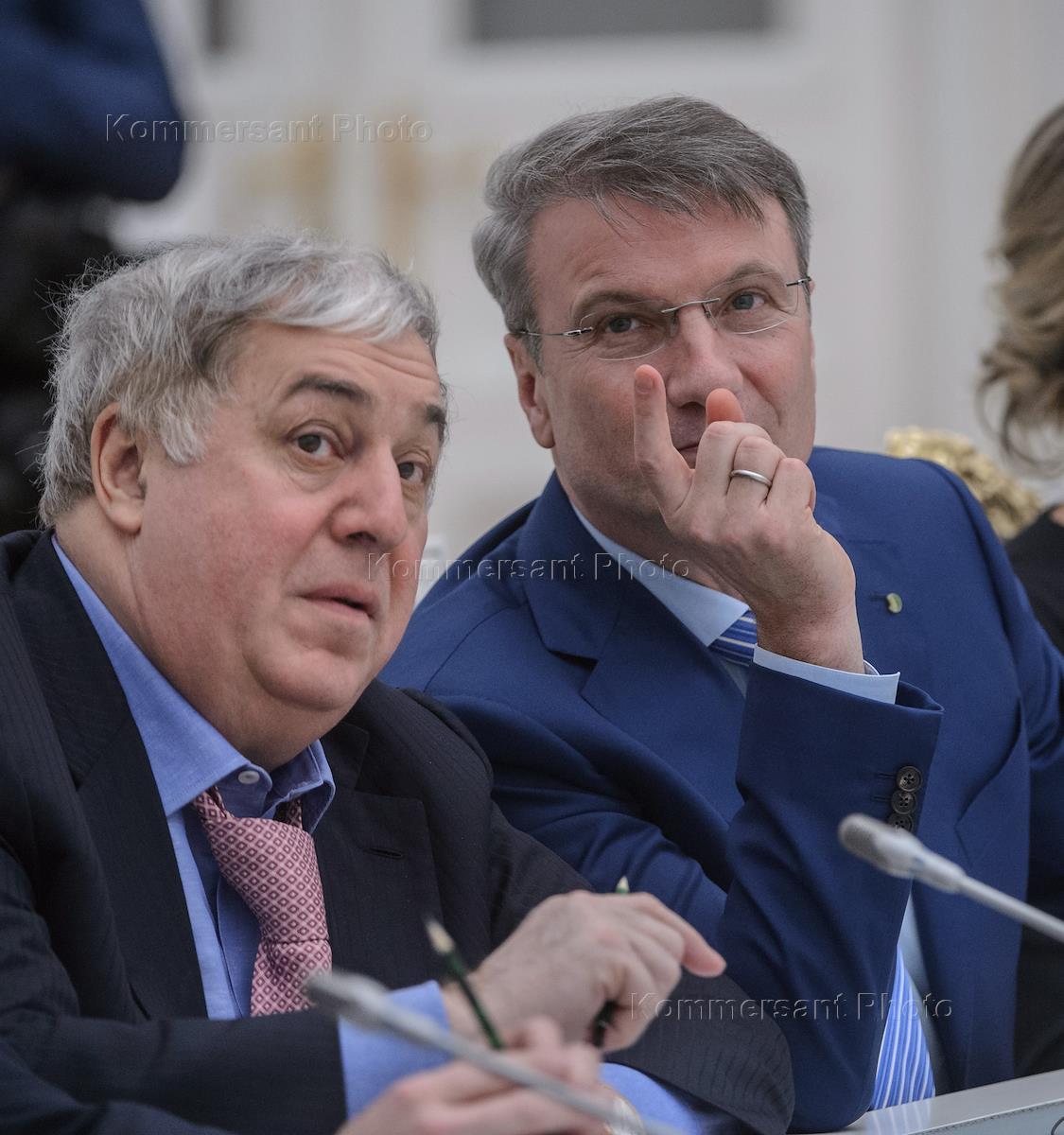Президент ОАО НК "Русснефть" Михаил Гуцериев (слева) и президент, председатель правления Сбербанка России Герман Греф (справа) во время заседания попечительского совета Мариинского театра в Кремле.