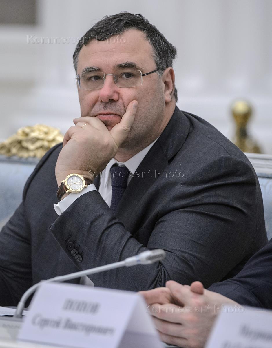 Бизнесмен Михаил Прохоров (слева) и основатель и член координационного совета Московской школы Управления "Сколково" Сергей Попов (справа) во время заседания попечительского совета Мариинского театра в Кремле.