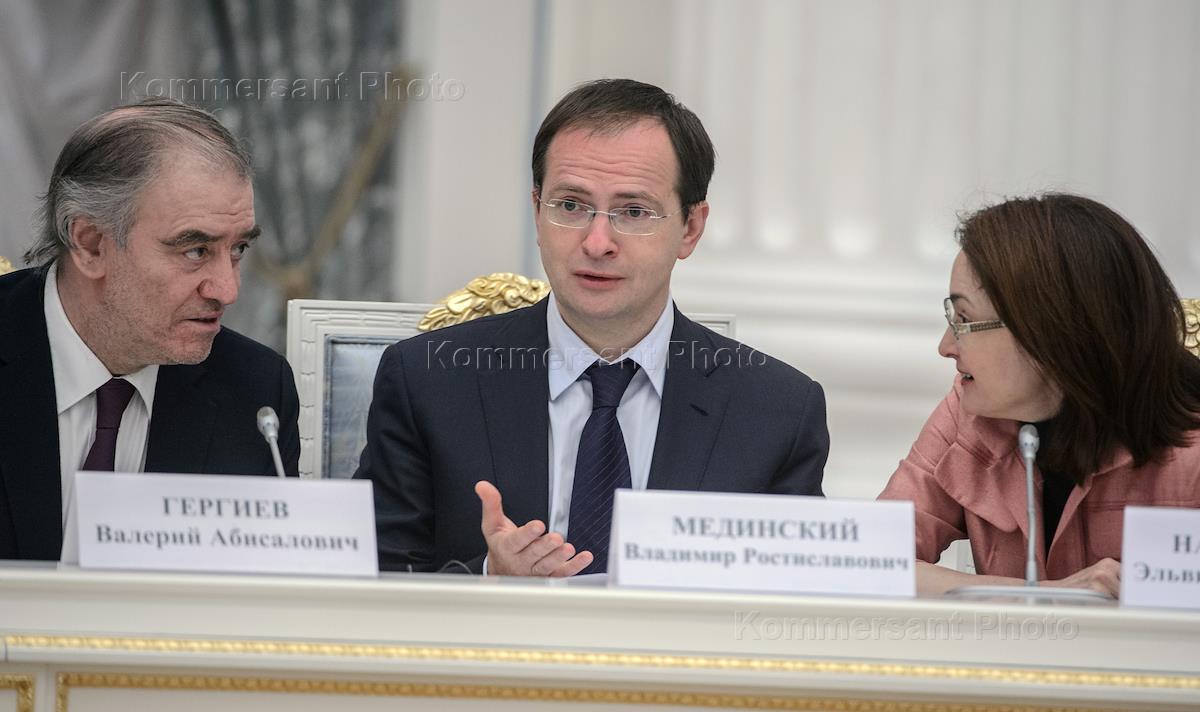Заседание попечительского совета Мариинского театра. Слева направо: художественный руководитель Мариинского театра, дирижер Валерий Гергиев, министр культуры России Владимир Мединский и председатель Центрального Банка России Эльвира Набиуллина во время заседания в Кремле.