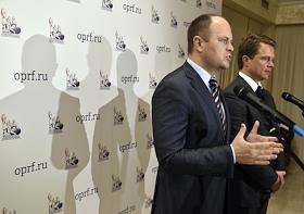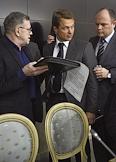Руководитель департамента транспорта и развития дорожно-транспортной инфраструктуры города Москвы Максим Ликсутов (в центре) и председатель комиссии Общественной палаты России по безопасности Антон Цветков (справа) после слушаний "Организация парковочного пространства в городе Москве" в Общественной палате.