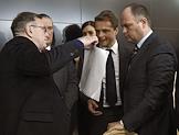 Слева направо: заместитель председателя комитета Государственной думы России по транспорту Александр Старовойтов, руководитель департамента транспорта и развития дорожно-транспортной инфраструктуры города Москвы Максим Ликсутов, председатель комиссии Общественной палаты России по безопасности Антон Цветков после слушаний "Организация парковочного пространства в городе Москве". Слушания прошли в Общественной палате.