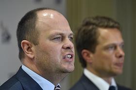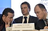 Руководитель департамента транспорта и развития дорожно-транспортной инфраструктуры города Москвы Максим Ликсутов (в центре) и председатель комиссии Общественной палаты России по безопасности Антон Цветков (справа) после слушания "Организация парковочного пространства в городе Москве". Слушания прошли в Общественной палате.