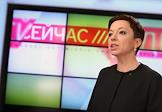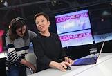 Работа телеканала "Дождь" в новом офисе на дизайн-заводе "Флакон". Съемка информационного блока "Здесь и сейчас". Студия. Телеведущая, заместитель главного редактора телеканала "Дождь" Мария Макеева (справа).