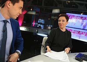 Работа телеканала "Дождь" в новом офисе на дизайн-заводе "Флакон". Съемка информационного блока "Здесь и сейчас". Студия. Корреспондент, телеведущий Игорь Севрюги (слева) и телеведущая, заместитель главного редактора телеканала "Дождь" Мария Макеева (справа).