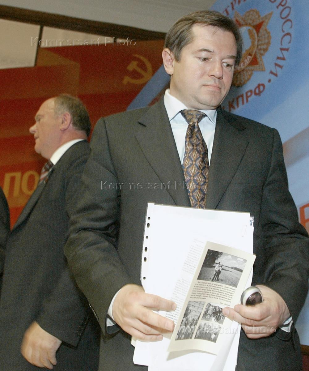 Gennady Zyuganov, leader of the Communist party (left) and the member of the Communist party, deputy Sergei Glaziev (right) during the press-conference on the programm of the Communist party