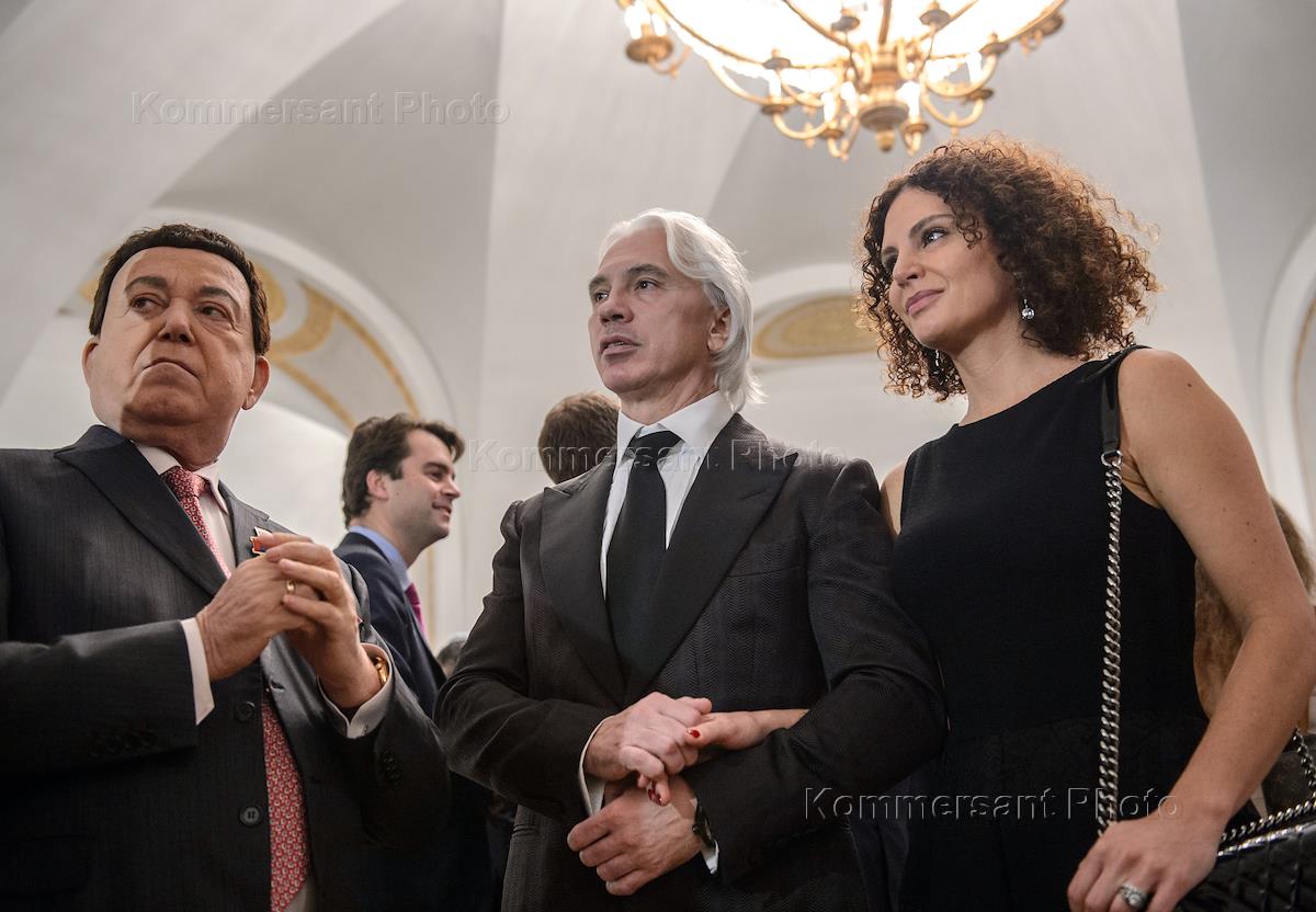 Церемония вручения государственных наград России прошла в Кремле. Первый заместитель председателя Комитета Государственной думы России по культуре Иосиф Кобзон (слева) и оперный певец Дмитрий Хворостовский (в центре) с супругой Флоранс Илли во время церемонии.