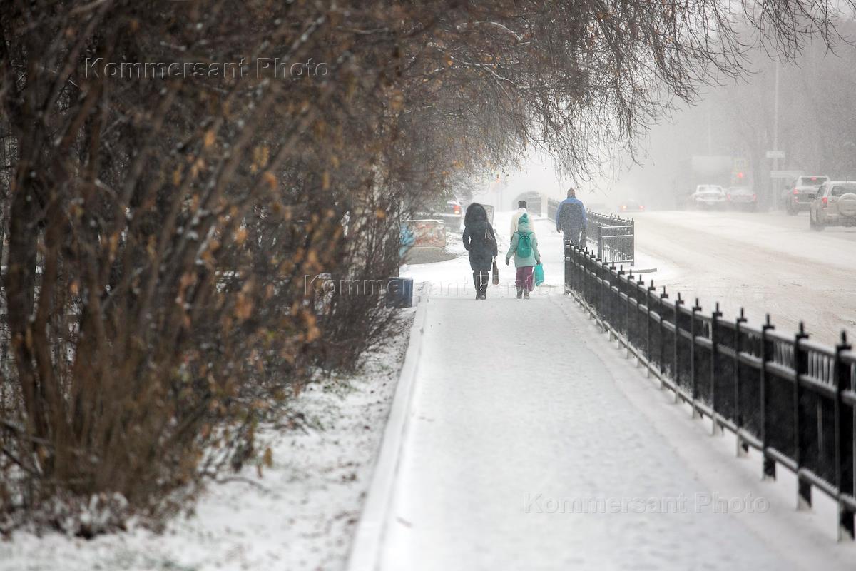 Жанровая фотография. Прохожие на тротуаре во время снегопада.