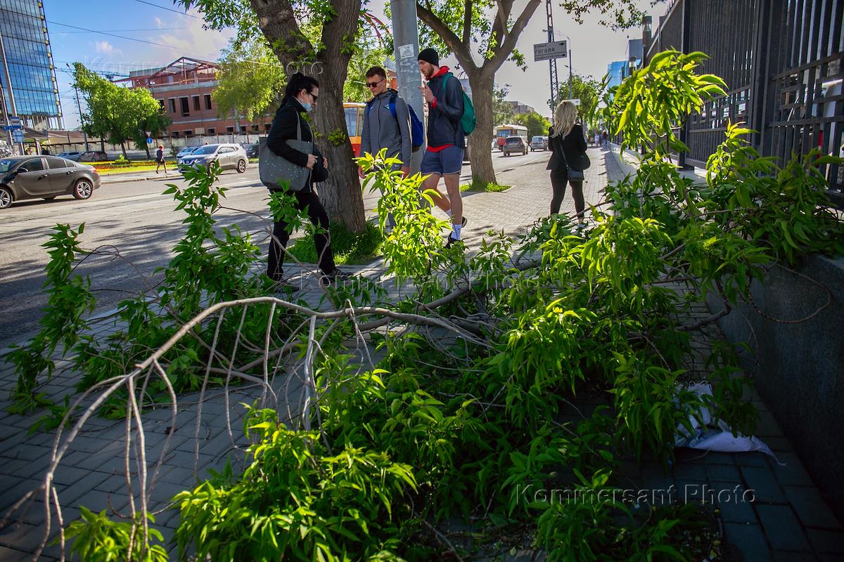 Екатеринбург время режима карантина из-за опасности распространения коронавирусной инфекции COVID-19. Жанровая фотография. Последствия урагана в Екатеринбурге. Упавшее дерево.