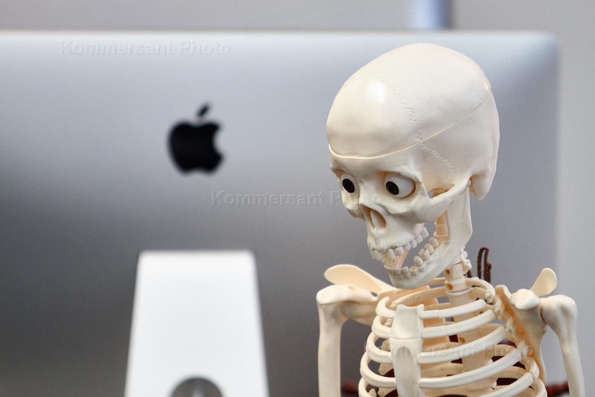 Жанровая фотография. Макет скелета человека рядом с компьютером.