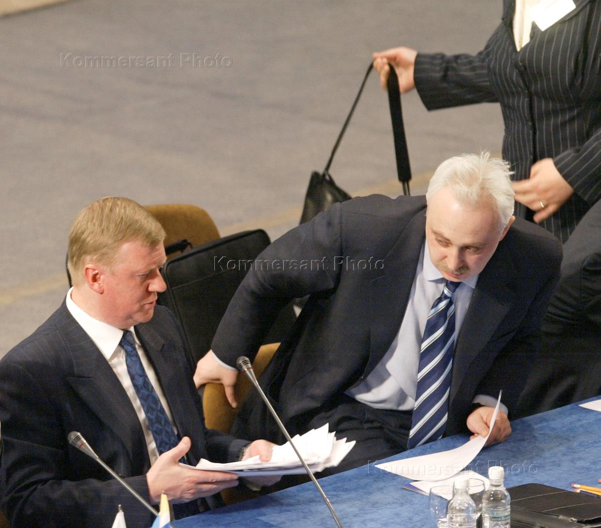 Председатель правления РАО "ЕЭС России" Анатолий Чубайс (слева) и первый заместитель председателя правления РАО "ЕЭС Россия" Леонид Меламед (справа) на заседании совета директоров РАО "ЕЭС России". Заседание прошло в здании зеленоградского Дома культуры. Во время заседания был избран новый состав совета директоров и подведены итоги за 2002 год.