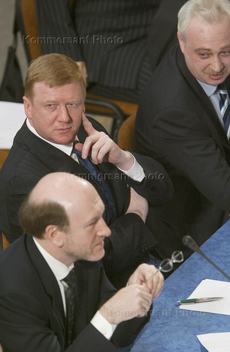 Глава администрации Президента России Александр Волошин (слева), председатель правления РАО "ЕЭС России" Анатолий Чубайс (в центре) и первый заместитель председателя правления РАО "ЕЭС Россия" Леонид Меламед (справа) на заседании совета директоров РАО "ЕЭС России". Заседание прошло в здании зеленоградского Дома культуры. Во время заседания был избран новый состав совета директоров и подведены итоги за 2002.