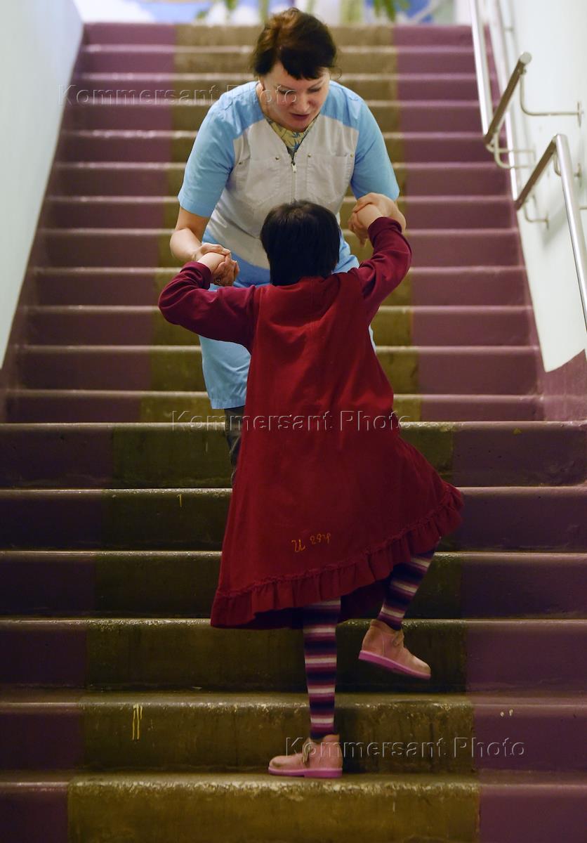 Воспитатель с воспитанницей-инвалидом Детского дома в Санкт-Петербурге.