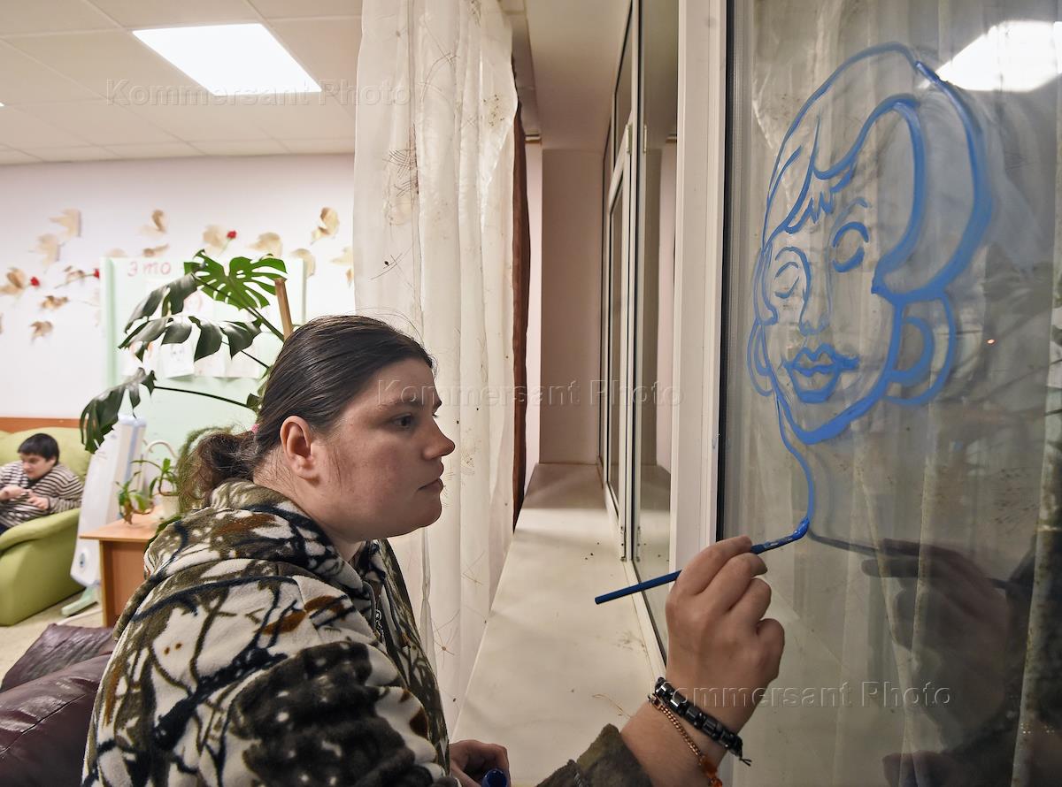 Психоневрологический интернат №3 (ПНИ №3) в Петергофе. Подопечная интерната рисует на стекле.