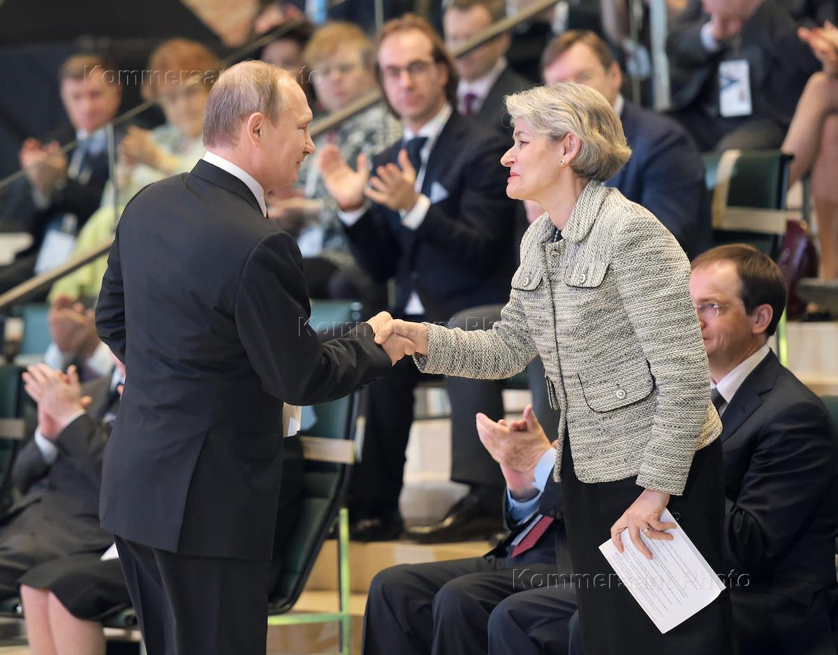 Рабочая поездка Президента России Владимира Путина в Санкт-Петербург. Президент России Владимир Путин (слева) и директор ЮНЕСКО Ирина Бокова (справа) на пленарном заседании IV Санкт-Петербургского международного культурного форума в Государственном Эрмитаже.