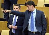 Член комитета Государственной думы (ГД) России по охране здоровья Александр Петров (слева) и заместитель председателя ГД России Сергей Железняк (в центре) во время пленарного думсктго заседания.